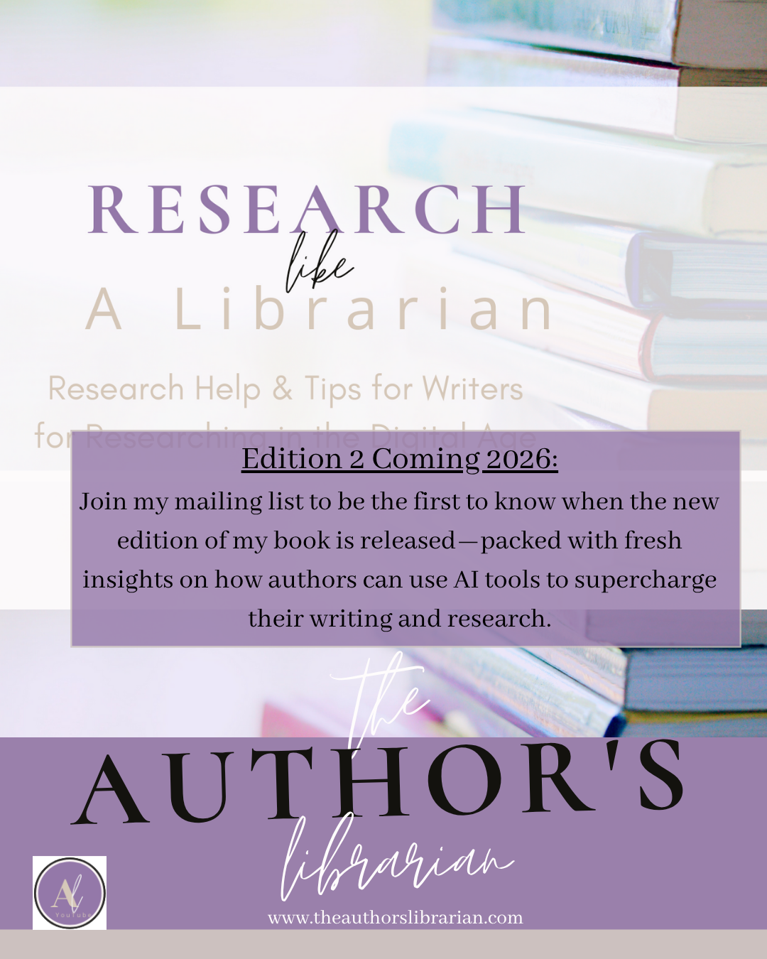 Her focus is to help authors improve their voice and strengthen their stories by sharing techniques of a librarian to enhance their research skills to take their writing to that next level!